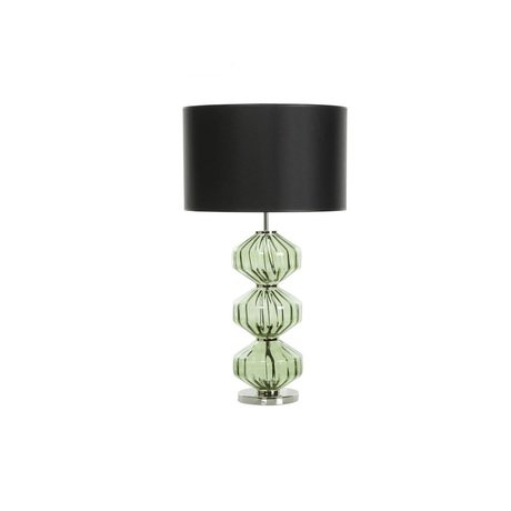 Прозрачное нежно-зеленое основание с хромированными элементами -- стеклянная гирлянда с "перекрученными" элементами. Черный, очень плотный абажур контрастирует с легким, воздушным основанием.