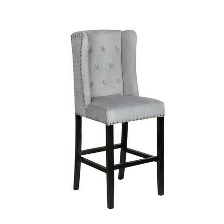 Стул Skipton grey velvet на высокий прямых ножках, с каркасом на основе массива натурального дерева и мягкой обивкой серого цвета из велюровой ткани. Выполнен в лаконичном дизайне, с четкими геометрическими линиями форм и оригинальным цветовым контрастом между темной нижней и светлой верхней частями. Модель по периметру украшена серебристыми заклепками, внутренняя часть спинки декорирована объемной стежкой. Стул предназначен для баров, ресторанов и кафе, пригоден также для жилых интерьеров.