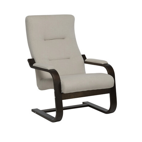 - Пружинящий эффект — кресло слегка покачивается благодаря каркасу на полозьях - Компактность — подойдет для помещений от 10 м² - Эргономичная спинка — поддерживает позвоночник во время длительного чтения Кресло идеально впишется в спальню, гостиную или домашний офис площадью от 10 м². Особенно оценят модель любители почитать в тишине — высокая спинка поддерживает шею и голову, а мягкие подлокотники позволяют расслабить руки. Бежевый велюр сочетается с любыми цветовыми решениями интерьера и гармонирует с темно-коричневым каркасом.Технические особенности: