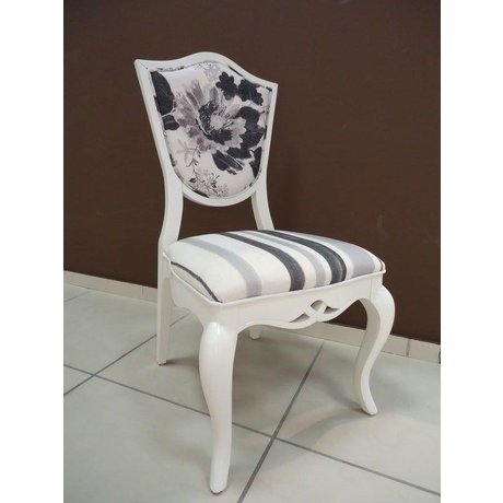 Стул с фигурной спинкой выполнен в классическом стиле. Отделка молочно-белый матовый лак. Сиденье обито тканью цветочной расцветки, спинка - тканью в полоску из ассортимента фабрики. Передние ножки гнутые, задние прямые под углом. Сделан из массива дерева